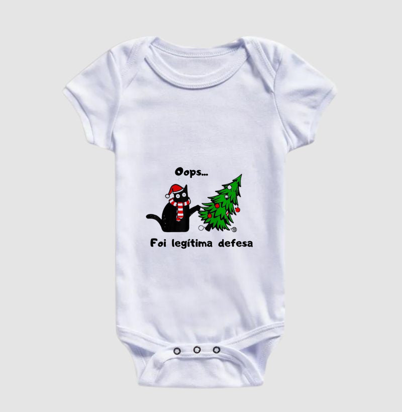 Vista o bebê com o body "Oops... Foi legítima defesa" e deixe que ele participe de cada abraço, foto e brincadeira de fim de ano com conforto, liberdade de movimento e estilo felino em todas as celebrações.
