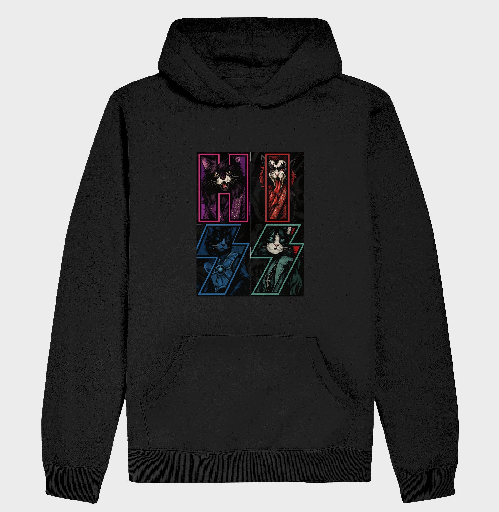 O moletom perfeito para quem vive no volume máximo, ama gatos e não abre mão de conforto. A arte HISS traz quatro felinos com visual de banda de rock clássica, em cores vibrantes e cheias de atitude.