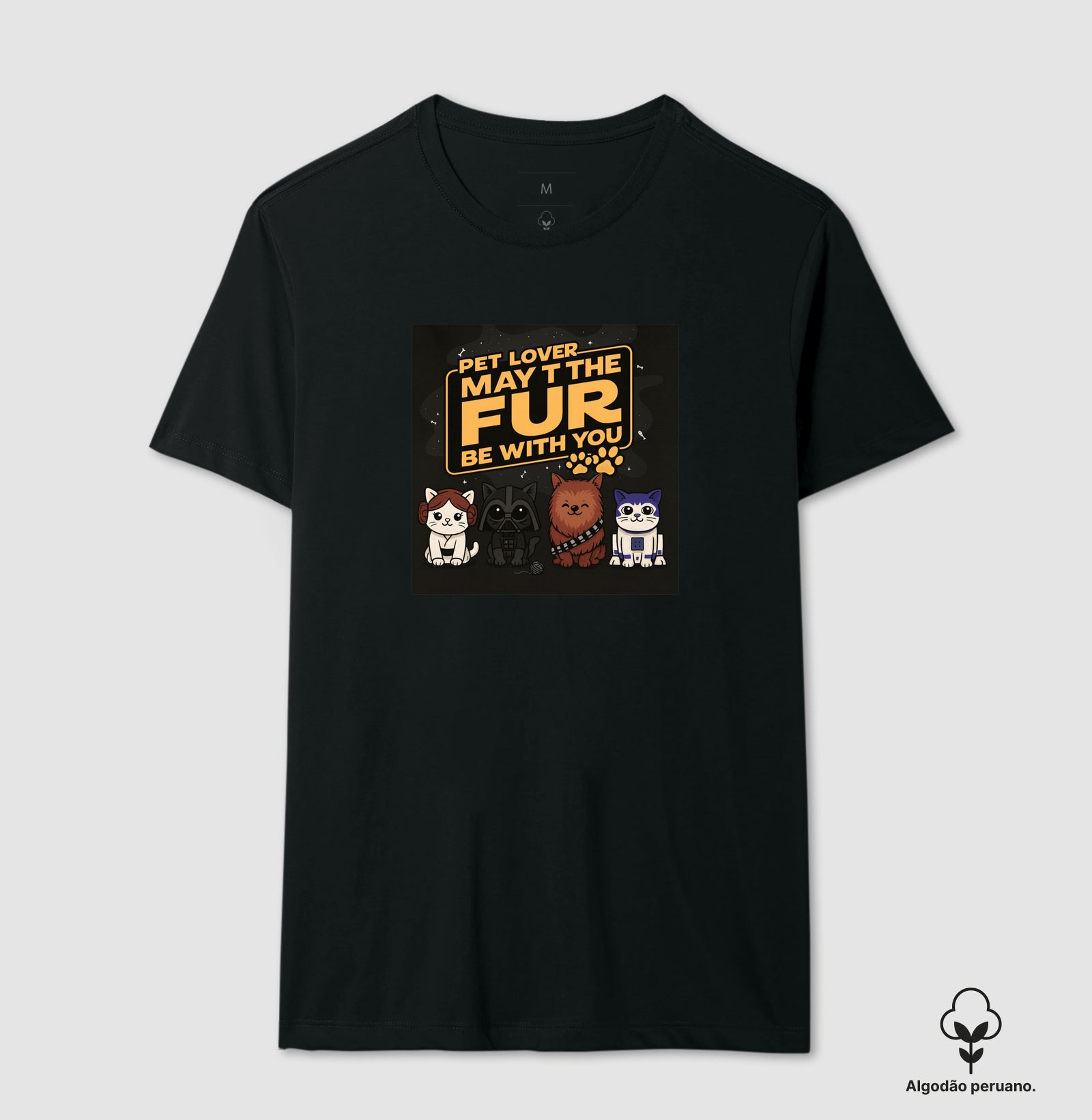 Os gatinhos e cachorros em estilo cartoon ocupam o centro da peça com a frase “Pet Lover – May The Fur Be With You”, criando um visual divertido para o dia a dia, passeios com o pet e encontros com a galera.