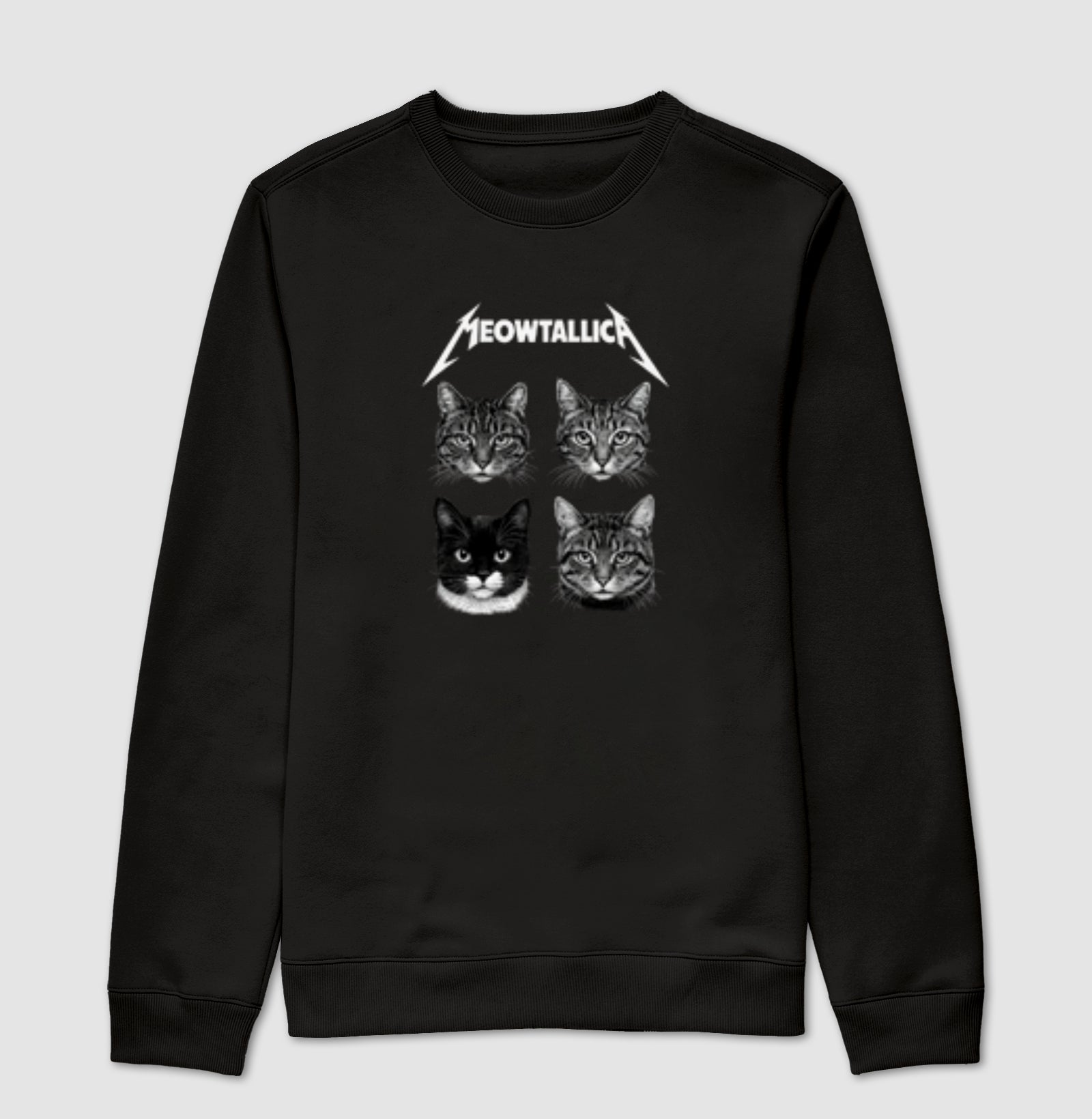 O moletom Meowtallica é para quem vive no volume máximo e divide o sofá com um gato. A estampa traz quatro felinos em estilo pôster de banda, com o logo "Meowtallica" em destaque, perfeita para quem curte metal, humor e conforto no dia a dia.